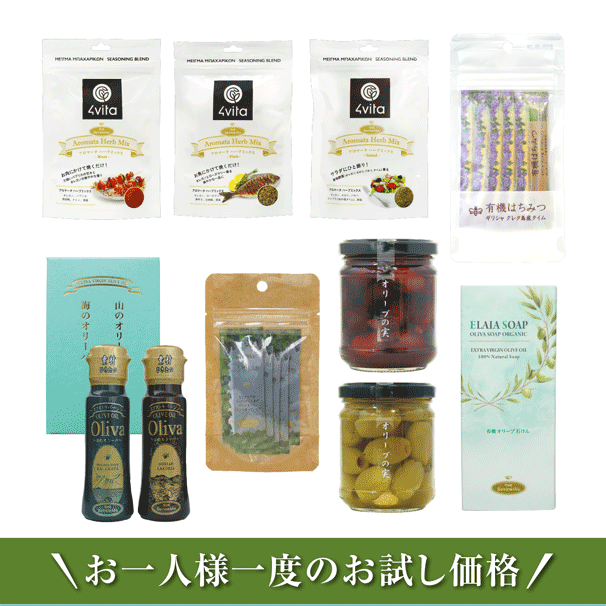 【 お試しセット - 送料無料 】EX海のオリーバ 229g、EX山のオリーバ 229g、バルサミコ250ml、グリーンオリーブ種ぬき、ハーブミックスforミート【 同一住所に一回限り 】