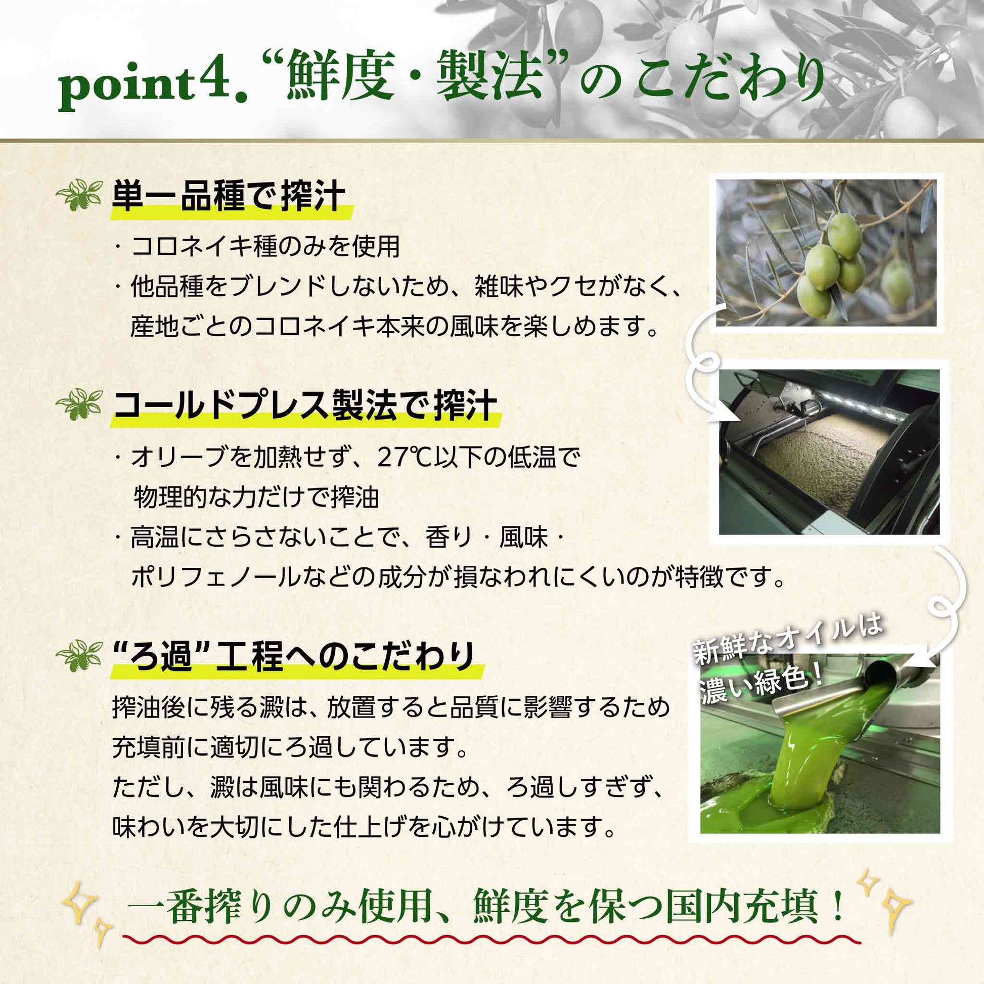 11月下旬から収穫が始まリますが、その時期に搾汁される一番搾りのオリーブオイルは風味が強く栄養成分がギュッと詰まっています。その時期に搾汁された一番美味しいオリーブオイルを確保し年間供給しています。