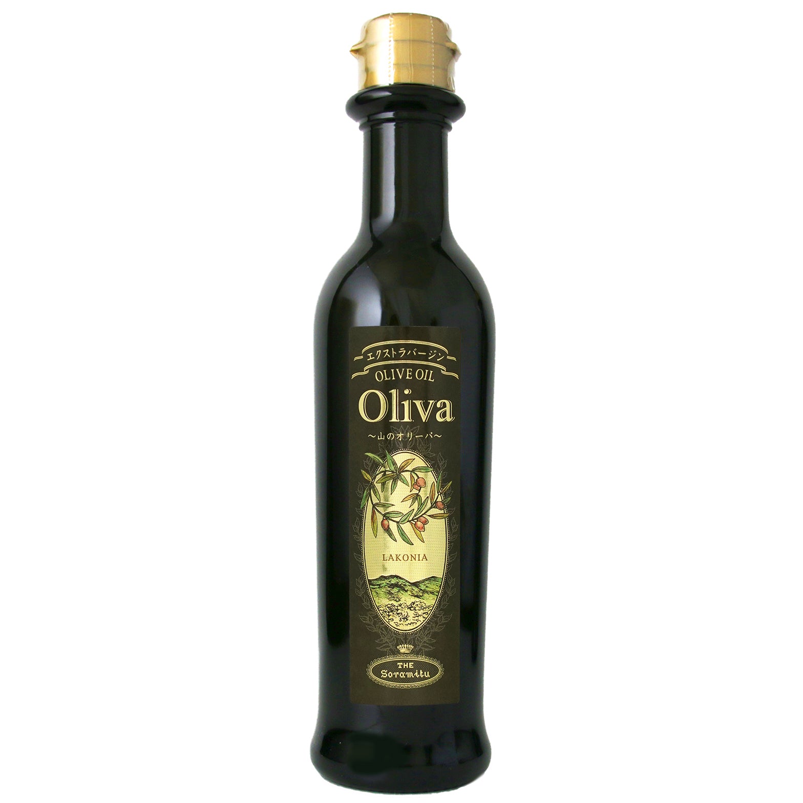 オリーブオイルは光に弱い為、透明瓶だと数週間も光に当たっていると緑色から黄色く変色し風味も落ちてしまします。そらみつでは最も光を通しにくい黒色瓶を使用しています。250ml瓶は、そらみつがデザインしたオリジナルボトルです。古代ギリシャでオリーブオイルを入れ使用していた壺型土器の形をイメージしてデザインしました。