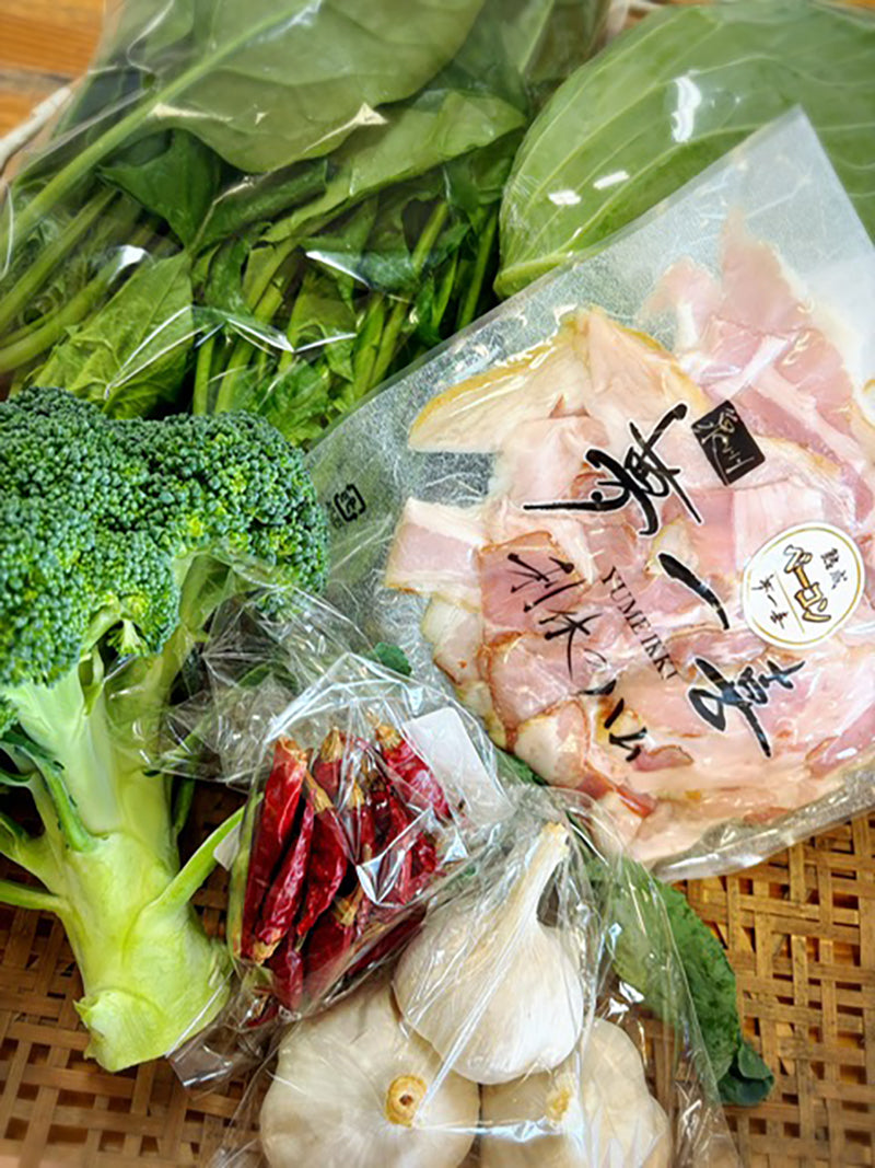 直売所(サザンぴあ)出荷農家を中心とした野菜3品目と国内産にこだわった唐辛子とにんにくに地元泉州で人気のハム製造メーカーのお得な切り落としベーコン(130g)のセットです。