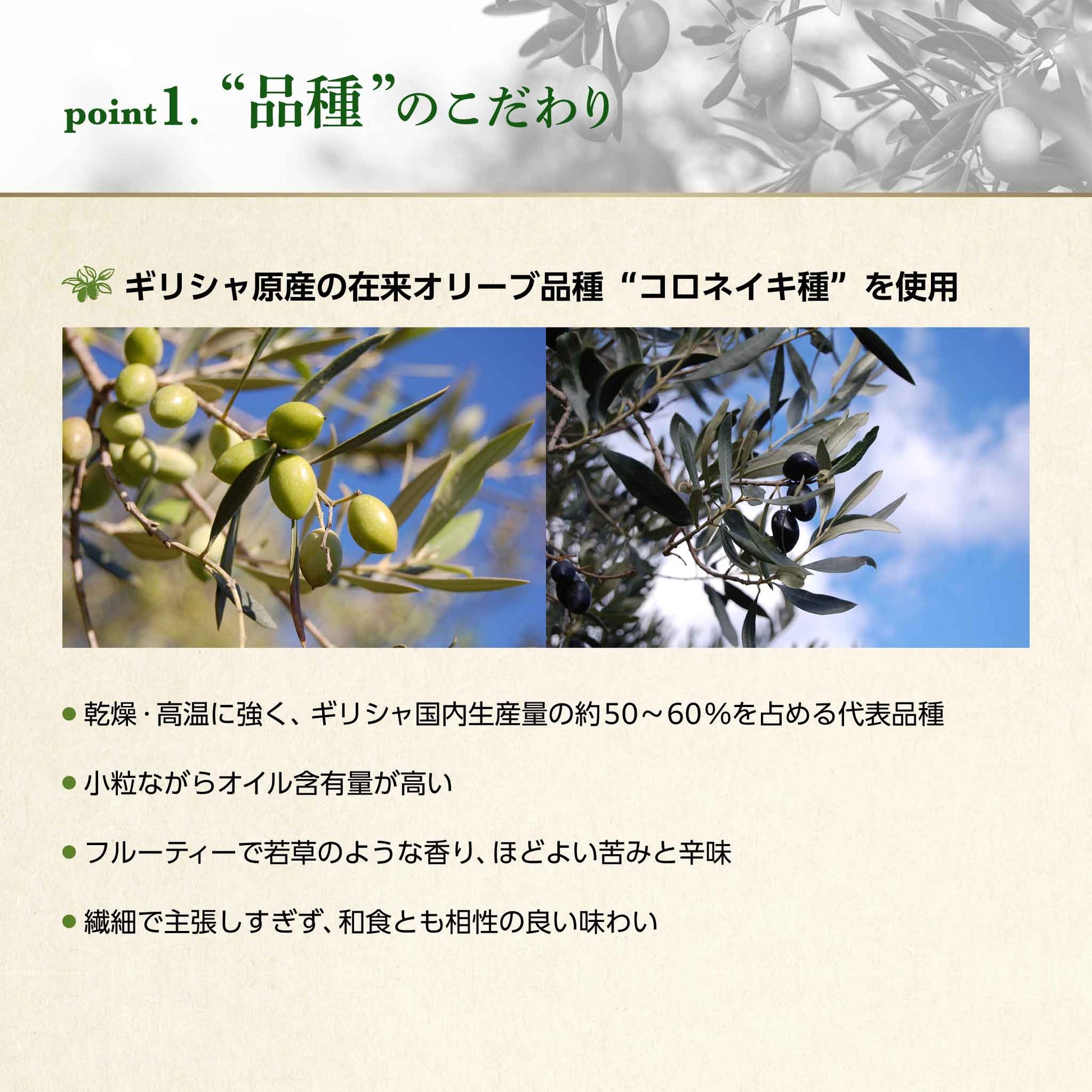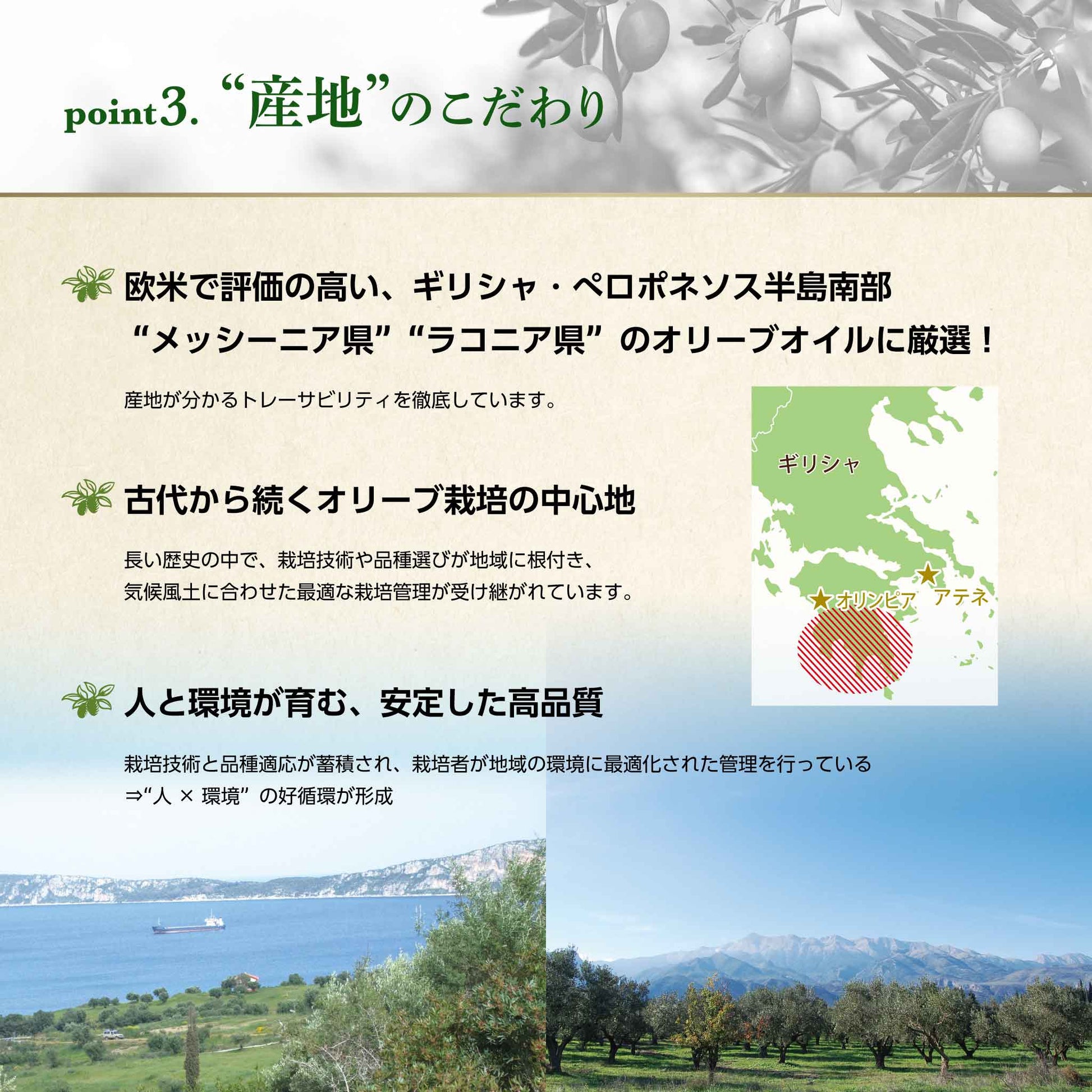 Even within the same EX olive oil that is only produced in the Kalamata region of Greece, you can enjoy the difference in flavor between the two types: Sea Oliva, which has a fragrant, gorgeous flavor, made from the juice of only olives grown on the sea side, and Mountain Oliva, which has a fruity, sweet flavor, made from the juice of only olives grown on the mountain side.
