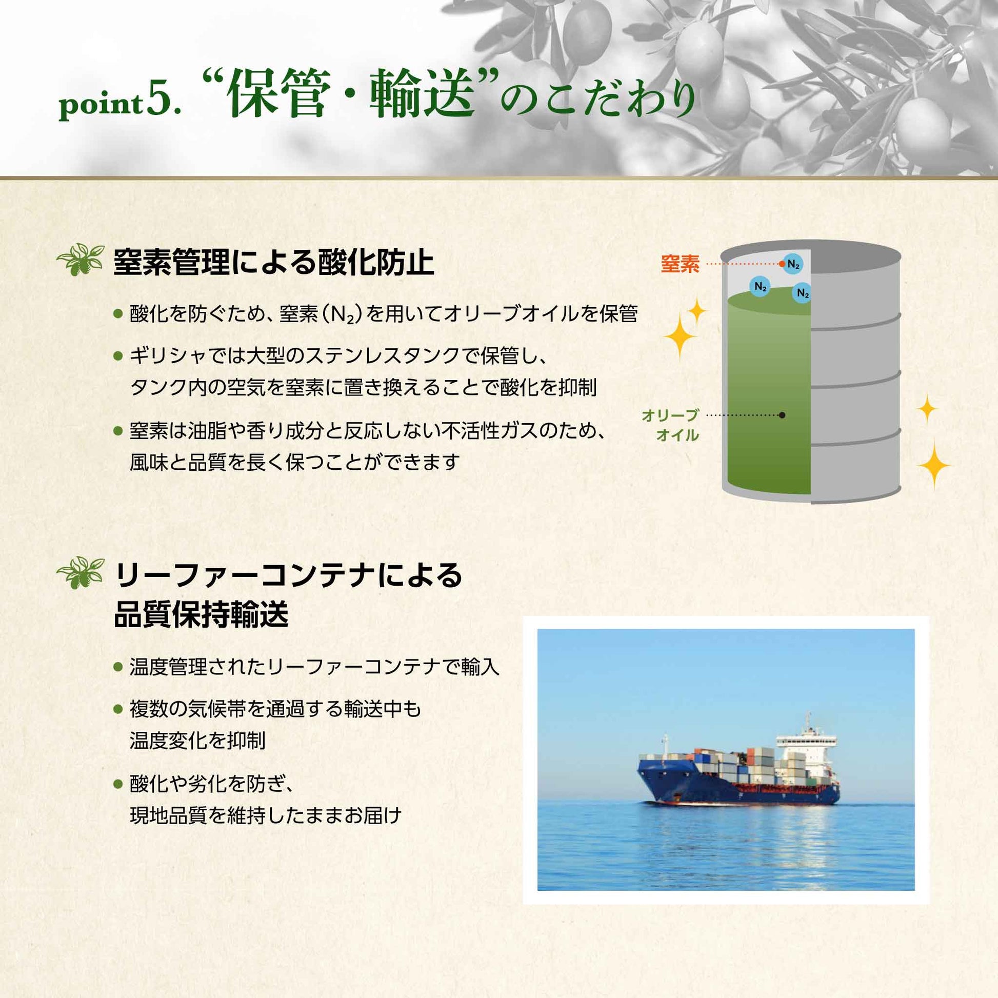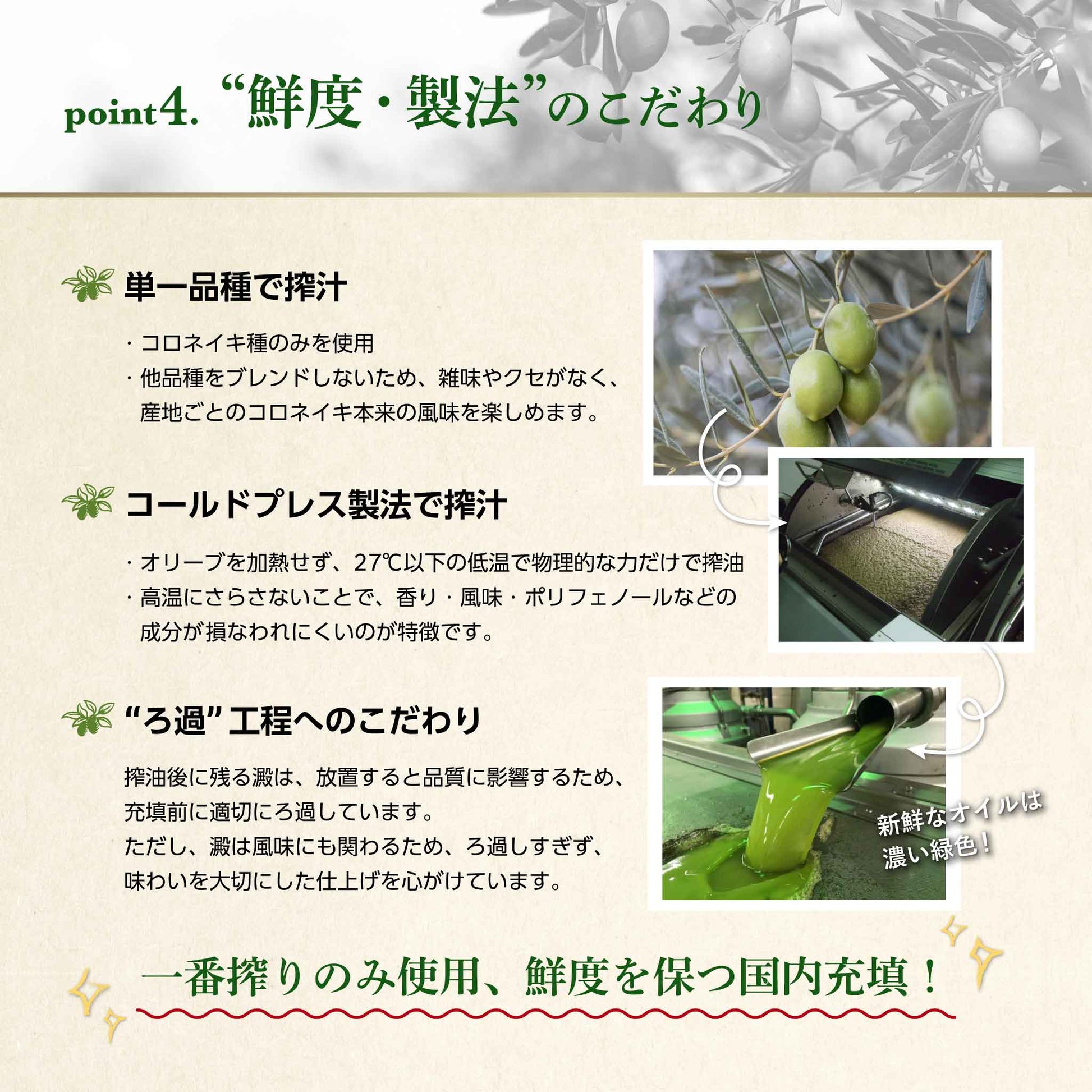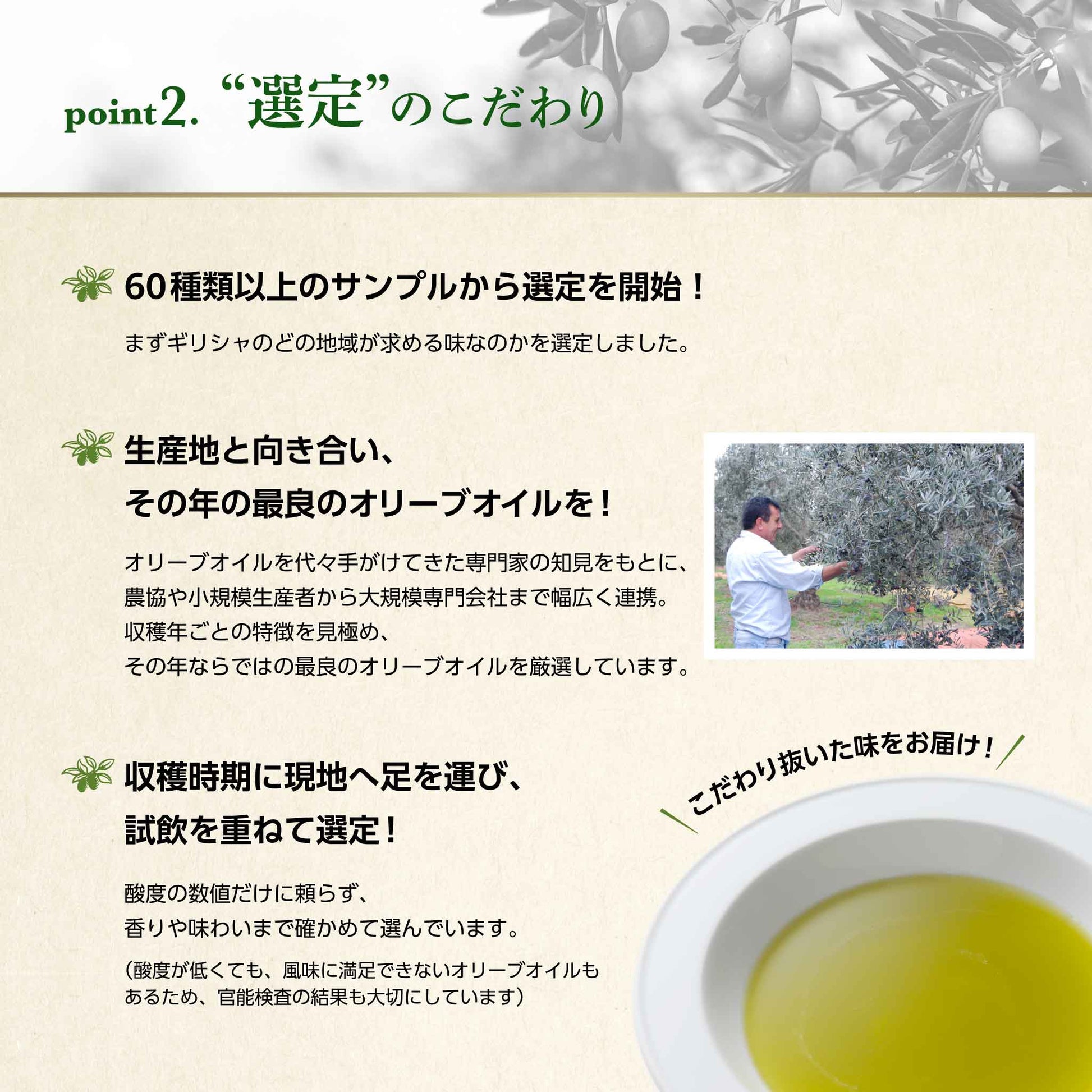 Soramitsu EX Olive Oil is made by physically squeezing olives at temperatures below 27℃, so it is essentially an agricultural product. The flavor varies depending on the region and place where the olives are grown.